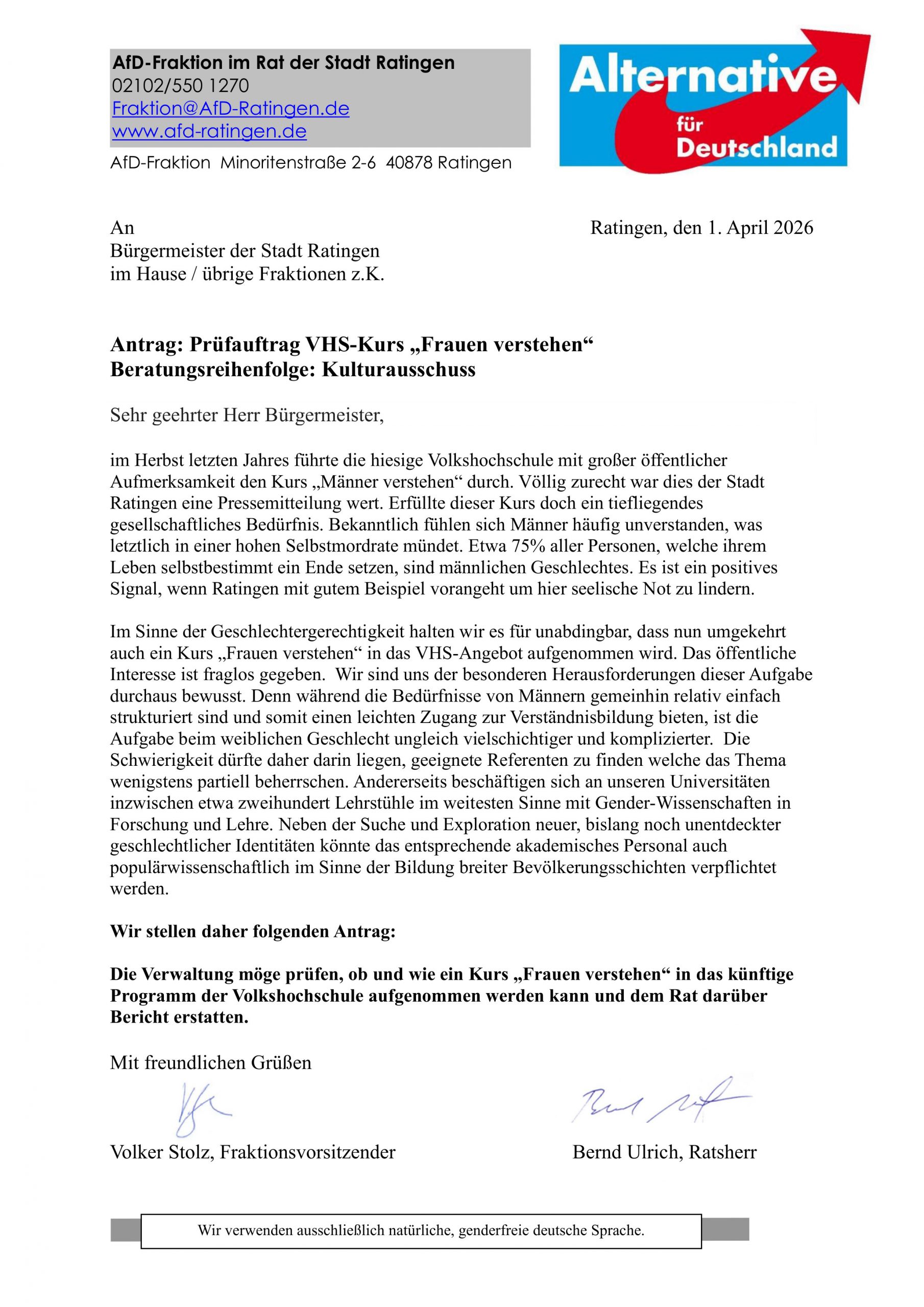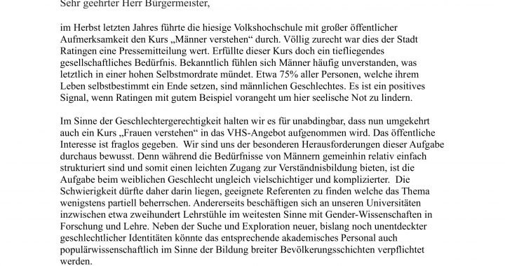 In Anlehnung an den bei der Ratinger VHS im Herbst durchgeführten Kurs „Männer verstehen“ https://supertipp-online.de/nachrichten/ratingen/vhs-ratingen-maenner-verstehen-ein-blick-hinter-die-fassade-id519924 beantragen wir mit dem heutigen Datum im Sinne der Gleichberechtigung der Geschlechter ein Kursangebot „Frauen verstehen“. Hier unser Antrag: